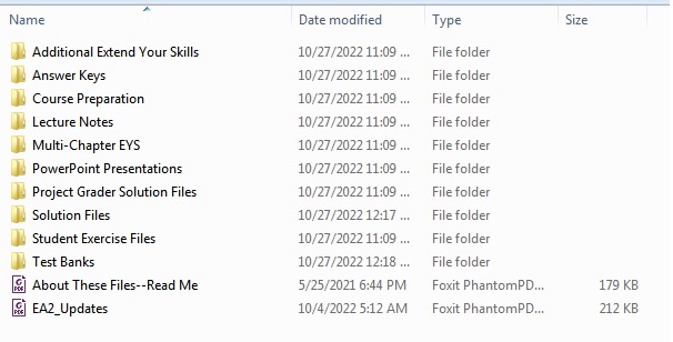This product is provided officially and includes “Solution Manual”, “Test Bank”, “Project Grader Solution Files”, “PowerPoint Presentations”, “Multi-Chapter EYS”, “Lecture Notes”, “Course Preparation”, “Answer Keys”, “Additional Extend Your Skills” and “Student Exercise Files”. Click here to see screenshot of the contents.